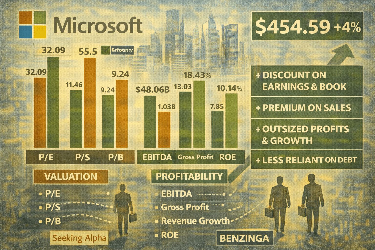 Benzinga’s data shows Microsoft trading at a discount on earnings and book, a premium on sales, and delivering above-average growth with strong profit scale and low leverage.